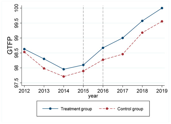 As shown in Figure 4, the treatment group’s GTFP was slightly ahead of the control group’s GTFP prior to the start of the pilot. However, this difference was quite small, and both groups showed similar trends in their respective changes. During the early stages of the pilot program (2015–2017), the treatment group continued to have higher GTFP levels than the control group, and the gap began to widen. During the later stages of the pilot program (2018–2019), a significant divergence in GTFP persisted between the control group and the treatment group, which even exceeded the magnitude of the prepilot disparity. This evidence implies that the policy interventions had a tangible effect, significantly increasing GTFP in the cities participating in the pilot program.