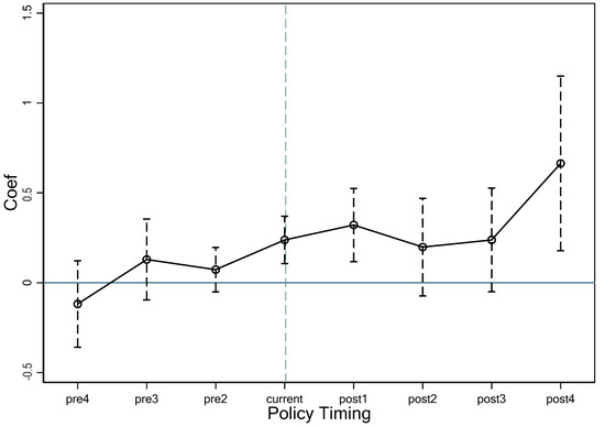 A critical assumption for policy evaluation using the DID model is satisfying the parallel trend condition. This implies that in the absence of the NBDCPZ implementation, the GTFP change trends between the control group and treatment group should show no significant differences. To verify this assumption, this study employs event analysis following Jacobson et al. (1993) [60]. As shown in Formula (2), is a series of dummy variables, which denote whether the NBDCPZ pilot policy was implemented in year k in city c. is the difference between the control group and treatment group at year k. If any of is significant during , it indicates that the control group and treatment group fulfill the parallel trend assumption prior to the policy’s implementation. This study chooses the first period before the pilot as the base period. Figure 5 shows the 95% confidence intervals for the dynamic effect’s estimated coefficients, which are not significant in the years before the pilot implementation. This reveals that the GTFPs of the treatment and control groups have a relatively similar change trend before the pilot, thus satisfying the assumption. Furthermore, for the first and fourth periods after the pilot, the estimated coefficients are significantly positive. These demonstrate that the construction of NBDCPZ does, indeed, have a substantial promotional influence on GTFP.
