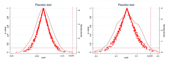 In order to exclude the impact of other random variables, this study executes an individual placebo test and a time placebo test by selecting treatment groups at random. This involves randomly selecting cities in our sample as pilot zones for the NBDCPZ, while preserving the same data distribution, to construct fictional treatment and control groups for regression analysis. If no interference from other random effects exists, the estimated coefficients corresponding to these fictitious policy dummy variables should be insignificantly distinct from zero. This suggests that the random selection of pilot cities has no significant effect on urban GTFP. To ensure the robustness of our findings, we repeat this random selection process 500 times via bootstrapping. Figure 6 (left) shows the kernel densities of the estimated coefficients and p-value distributions. The distributed coefficients randomly cluster around zero, with their corresponding p-values basically bigger than 0.1. Meanwhile, the coefficient of the real policy dummy variable DID is 0.2291, marked by the dashed line in Figure 6, and it is obviously different from those obtained in the placebo test. Additionally, this study conducts a time-point placebo test with the generated kernels of estimated coefficients and their p-value distributions plotted in Figure 6 (right). Similar to the individual placebo test, the distributed coefficients randomly cluster around zero, with their corresponding p-values basically bigger than 0.1. Therefore, we conclude that random factors do not disrupt the NBDCPZ’s influence on GTFP. The policy effect of the NBDCPZ is not a coincidence, which bolsters the robustness of our baseline conclusions.