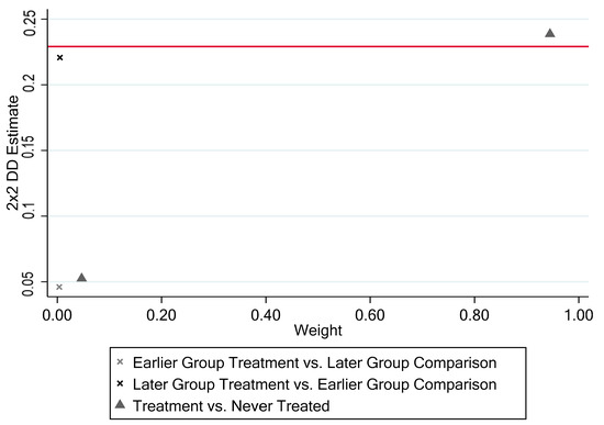 Considering that the policy’s pilot project was implemented in two separate phases, potential biases might be present. This is because the staggered difference-in-differences estimation is essentially a weighted average of varying treatment effects. In instances where negative weights occur, the weighted average of treatment effects may significantly diverge from the true average treatment effect. Therefore, the Goodman-Bacon decomposition method is implemented (Goodman-Bacon, 2021) [63] to assess the degree of bias within DID estimations. The results of this decomposition, as illustrated in Figure 7, indicate that an appropriate weighting of treatment effects results in a remarkably high convergence rate of 99.96%. This lends further support to the robustness and reliability of our findings.