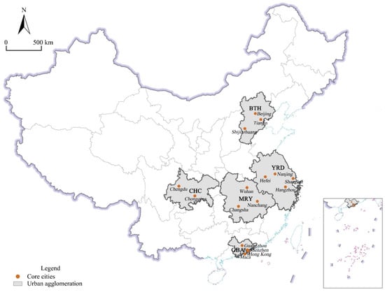 This paper takes five urban agglomerations in China as research regions (Figure 1). The five urban agglomerations, which consist of 107 cities at the prefecture level and above, include the Beijing-Tianjin-Hebei region (BTH), the Yangtze River Delta region (YRD), the Guangdong-Hong Kong-Macao Greater Bay Area (GBA), the Chengdu-Chongqing region (CHC), and the Middle Reaches of the Yangtze River region (MRY). The five urban agglomerations are representative as they are the most innovative regions in China and have the highest development level of the automobile manufacturing industry in China. According to the fourth economic census yearbook of China and relevant provinces, the number of legal entities in the automobile manufacturing industry in the five major urban agglomerations in 2018 was 59,600, and the business revenue of the automobile manufacturing industry above the scale was CNY 574,148.9 million, which accounted for 68.0% and 72.8% of the national share, respectively. Meanwhile, the rapid development of China’s high-speed rail stimulates frequent interactions of urban innovation actors within and across the city and urban agglomeration, which has led to increasingly dense innovation linkages between cities.