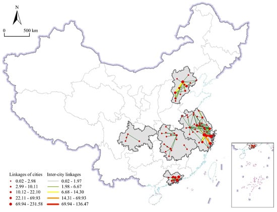 The cities with higher innovation linkages in the intra-city innovation networks are all core cities of urban agglomerations or cities with higher levels of economic development (Table 3). Furthermore, we can observe that those cities are mainly located in the YRD and GBA. Specifically, among the top 20 cities, 11 are core cities of urban agglomerations, and 15 have a GDP of over RMB 1 trillion. There are 15 cities located in the YRD and GBA, with nine and six in the YRD and GBA, respectively. This is in line with our expectations. The YRD and GBA are the catchment areas of China’s automobile manufacturing clusters, and the core cities of urban agglomerations and cities with higher levels of economic development cluster a larger number of automobile manufacturing enterprises and their upstream and downstream service enterprises, universities, research institutes, and productive service organizations, providing the basis for the formation of the automobile manufacturing innovation network. Meanwhile, these cities have attracted many talents, with rich knowledge, well-developed transportation and communication facilities, which support the development of dense innovation networks within the cities.