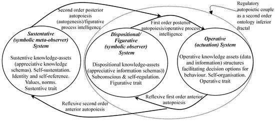 The disposition–operative relationship may be taken as an inferior fractal with a second order ontology. It is embedded in a superior fractal (otherwise just referred to as the fractal), so defined through its third order ontology. Here, sustentation acts as a disposition that regulates the inferior fractal which may be seen as an autopoietic system in its own right [33]. In higher-order cybernetics, the concept of agency is integral and builds upon the second order. The symbolic observer plays an active role in creating and understanding the system, leading to mutual interactive influence between operations and disposition that constitutes both the symbolic observer and the observed. This view is particularly relevant in third-order cybernetics due to its increased complexity. The third-order cybernetic perspective recognises that a fractal of second-order disposition–operative relationships has a meta-disposition that takes its context into account in a higher-order ontological hierarchy. Agency can be defined in terms of power potentials, with the dispositional potential representing the innate idiosyncratic regulatory structure that (as previously noted) with personification might be called personality, and an operative potential encompassing both innate structural and learned capabilities such as skills, with both being subject to sociocultural conditioning. Differentiating between dispositional and operative potential allows for a comprehensive understanding of how external and internal factors contribute to overall agency performance, emphasising the autopoietic connection between them that enables self-organisational processes (cf. [32,55]).