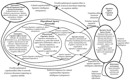 Figure 2 provides a dual (interactive) MAT model, one aspect representing cognition influence by affect, the other with affect influenced by cognition. The cognitive version of the model interacts with the affect version through their operative system to create the cognition–affect agency that has both cognition that determines rationality, and emotion that creates personal context. The operative system is anterior to the dispositional figurative system, and their combination as an autopoietic couple (as a system in its own right) is anterior to the sustentative system. This suggests that autopoietic processes are not only the property of cognition, but also of affect, and where cognition and affect autopoiesis are mutually independent. Posterior systems coincide with a higher-order ontology. Autopoiesis and autogenesis are central to this structure. Yolles and Fink [32] explain their equivalence with Piaget [35] intelligences. Intelligence is the ability to comprehend the knowledge-assets of a source and construct new knowledge-assets, enabling the character and influences of a source to be appreciated. The intelligences have reverse trajectories, one originating from the posterior system and the other from the anterior system, defining circular reflexive causality, often referred to as feedforth and feedback. Three types of intelligence are identified: behavioural, operative, and figurative. Consider that a subject has a set of parameters that define its character, the subject being an agency environment or a system within it. Agency behavioural intelligence connects environmental event parameters to the operative system, enabling the identification, selection, and measurement of that character through parameter evaluation. Its anterior and posterior orientations allow the operative system to recognise environmental changes and enable agency intervention in the environment. Operative intelligence facilitates autopoiesis that couples the operative and figurative systems, allowing self-organisation, operative system adaptation along the posterior originating operative intelligence, and dispositional figurative system adaptation along the anterior originating operative intelligence. The autopoietic system formed in the autopoietic couple maintains stability when the information it holds is intrinsic [12]. This intelligence provides structure-forming stability and allows autopoietic processes, operating along the posterior emerging operative intelligence, to deliver operative adaptations and, along the anterior originating operative intelligence, to deliver, as noted earlier, dispositional adaptation. Figurative intelligence enables self-creation (autogenesis) by acquiring information from parameters in the autopoietic system, seeking to correct instability, and providing regulatory and operative direction to improve autopoietic coherence. The distinction between the cognition and affect versions of Figure 2 is that in the former the intelligences are cognitive, while in the latter they are emotional [67].