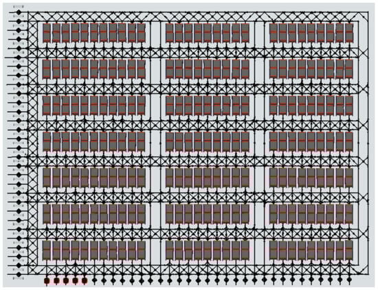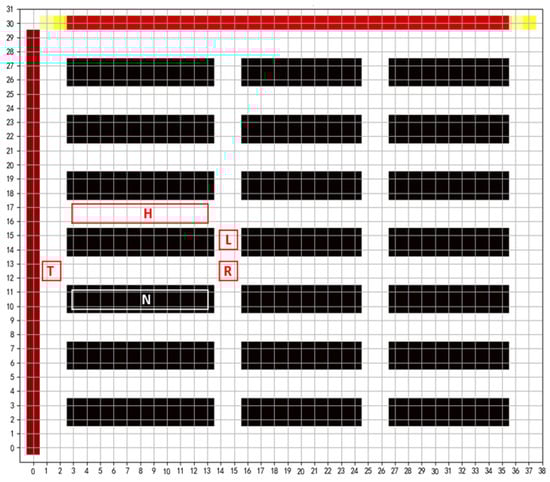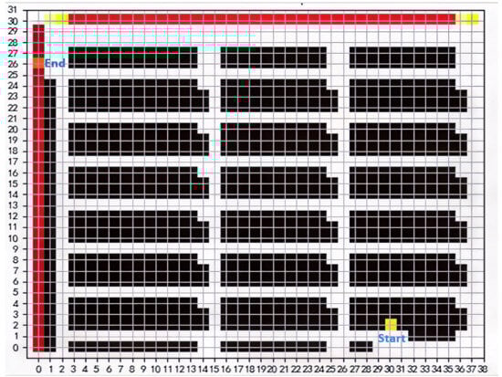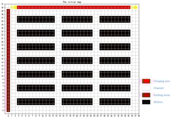 The intelligent warehouse model represented by a grid is adopted. The model’s environment is flexible and reconfigurable, as depicted in Figure 1. The grid map is divided into four sections: