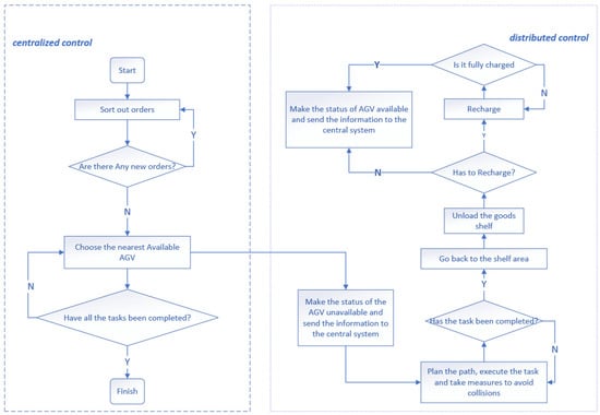 The proposed centralized and distributed control process for intelligent warehouse is illustrated in Figure 3.