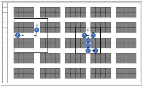 Zhang (2018) [] proposed a dynamic weighted map to indicate the level of congestion on each road, which enabled the route planner to avoid congested channels. However, this may result in suboptimal routes. When AGVs encounter highly congested destination areas, blockages and deadlocks are still likely to occur. To address this issue, this paper draws inspiration from real-world traffic and employs bidirectional channels for planning routes for multiple AGVs. However, previous research has shown that the implementation of the ‘move on the right’ rule presents a challenge for the A* algorithm, as it cannot automatically select the appropriate channel for AGVs. To address this issue, this paper proposes a solution based on dynamic maps. With this approach, each AGV will have its own independent map, which is dynamically updated to ensure compliance with traffic rules. According to the starting and ending points of AGVs, the algorithm dynamically sets up obstacles in the left channel of potential routes and utilizes the updated map as an input for route-planning algorithms to obtain optimal routes. The specific methodology is presented as follows:
