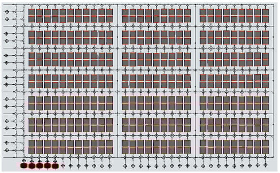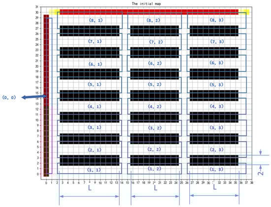 According to the allocation of the shelf and packing areas, the entire warehouse is divided into multiple regular sub-areas, as shown in Figure 5. Each shelf area comprises several shelving stations with a size of 2*L. The sub-area is identified by its sequence number (m, n), where m represents the row number, and n represents the column number. The location of the packing area is designated as (0,0). It is noted that generalizations facilitate the modeling of a real warehouse, while Figure 5 serves to illustrate its operations and is exemplified by the inclusion of two numbers (29,38) to delineate the scope of the warehouse.