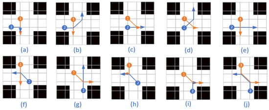 The collision in case (j) occurs between two nodes. The route points with sequence numbers and + 1 of the AGV1 correspond to those with sequence numbers and of the AGV2. If conditions (7)–(9) are satisfied, the collision in case (j) will occur.