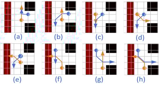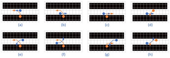 Under normal circumstances, bidirectional channels do not result in collisions. However, when an AGV returns to the channels from a non-channel area (such as charging, packing or shelf areas) or needs to traverse reverse channels into non-channel areas on the opposite side, conflicts may arise with AGVs moving along the corresponding channels. As illustrated in Figure 13, there exist eight distinct collision scenarios. In cases (a)–(d), one AGV proceeds straight while the other turns; in cases (e)–(h), both AGVs turn. In cases (a)–(c) and (e)–(g), one AGV enters the channel from a non-channel area; in cases (d) and (h), at least one AGV enters a non-channel area from the channel. Given that the collision scenarios are identical across different non-channel areas, this paper solely analyzes bidirectional channels within shelf areas.