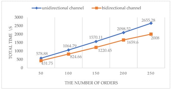 - Figure 17 shows the total time consumed by the AGVs to complete all the orders in two different types of warehouses. The number of AGVs in both types of warehouses is 10, and the number of orders is 50, 100, 150, 200 and 250. In general, the total working time for the AGVs in two types of warehouses increases with the increase in the order number, but the warehouse based on the bidirectional channel can save nearly a quarter of the time. It is obvious that the bidirectional channel can greatly improve the operating efficiency of the intelligent warehouse.