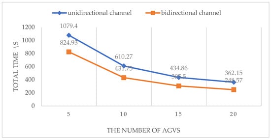 - Figure 18 shows the total time taken by the AGVs to complete 50 orders in two different types of warehouses. The number of AGVs is 5, 10, 15 and 20. Generally, the time required for the AGVs to complete the task decreases with the increase in the number of AGVs. Compared with the unidirectional channel, the bidirectional channel can effectively reduce the processing time of the AGVs. However, when the number of AGVs reaches a certain value, the decrease in the time required for the AGVs to complete the orders will slow down. Because the number of AGVs increases, the blocking degree and waiting time for AGVs also increase. Therefore, it is necessary to adjust the number of AGVs according to the size of the warehouse in order to make a more rational use of the resources.