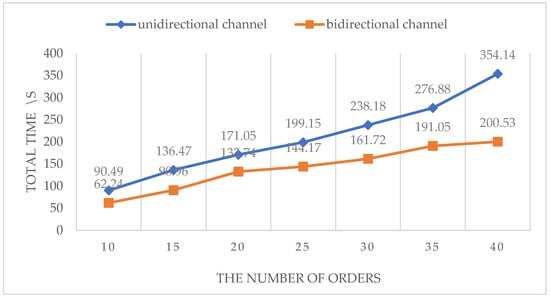 - To demonstrate the efficiency of AGVs when orders are concentrated in a small area, all the orders are generated in the shelf area in the lower left corner. Figure 19 shows the total time required by AGVs to complete different orders in two different types of warehouses. The numbers of orders are 10, 15, 20, 25, 30, 35 and 40, and the number of AGVs is 10. Generally, the time required for the AGVs to complete the task increases with the increased orders. Compared with the unidirectional channel, the bidirectional channel can effectively reduce the processing time of the AGVs. When all AGVs work in a small area at the same time, congestion in the unidirectional channel increases significantly with the increase in orders, which is demonstrated by the derivative of the upper line in Figure 19. In this case, the advantage of the bidirectional channel can be well displayed.