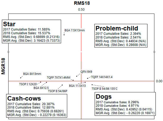 Figure 5 presents the BCG Matrix for the top ten selling products using RMS = 0.500 and MGR = 0.000 as reference lines. This matrix divides the top ten products into four groups—Stars, Cash Cows, Dogs, and Problem Child—providing detailed information on cumulative sales percentages, average RMS and MGR, and standard deviations for both 2017 and 2018.
