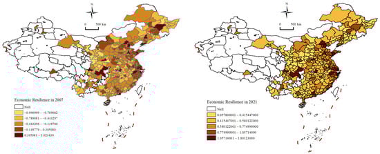 Spatial distribution of economic resilience in China’s 284 cities in 2007 and 2021. Note: The map was created using data from the National Geographic Information Public Service Platform of China, with no modifications made to the base map. The same applies to all other maps.