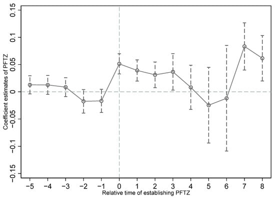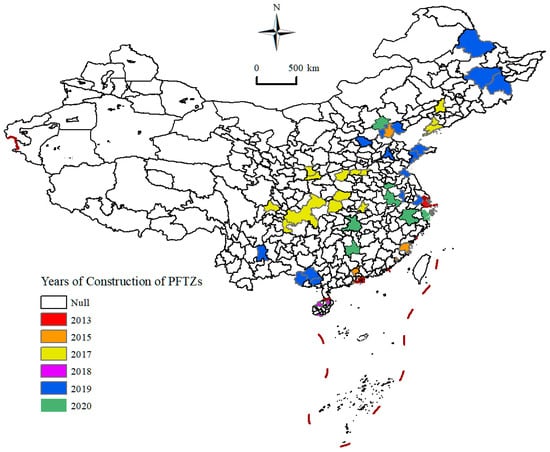 Although the overall policy of PFTZs is issued at the provincial level, in practice, except for the four municipalities directly under central government administration—Shanghai, Tianjin, Chongqing, and Guangzhou—all other PFTZs are constructed and developed within subordinate prefecture-level cities. Therefore, in this study, the construction of PFTZs is defined as a virtual variable at the urban level, indicating whether a city has a Pilot Free Trade Zone in a given year. If so, it is coded as 1; otherwise, it is 0. Specifically, , where represents a city-level dummy variable. It is coded as 1 if city i was approved for a Pilot Free Trade Zone during the sample period and 0 otherwise. represents a city-year-level dummy variable; it is coded as 1 if year t is on or after constructing PFTZs in city i and 0 otherwise.
