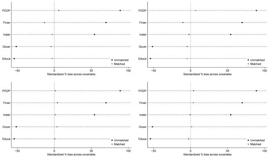 If individuals participating in the experiment are directly considered as the treatment group and those not participating as the control group in regression analysis, there may be a “self-selection” bias, potentially affecting the credibility of DID estimation results. Therefore, this study follows Li et al. (2024) and Zhuo et al. (2021) and adopts Propensity Score Matching (PSM) combined with the Difference-in-Differences (DID) method, forming the PSM-DID approach [15,37]. PSM is used to select control group individuals who are as similar as possible to the treatment group, thereby mitigating the “self-selection” bias, followed by DID to estimate policy effects. Given the specific nature of panel data in applying the PSM-DID method4, this study employs two main approaches: “pooled matching” and “period-by-period matching.” Additionally, it utilizes two matching techniques, “k-nearest neighbor caliper matching” and “kernel matching”, with parameters set at k = 4 and caliper = 0.05. The operational process is as follows: First, logit models are used to estimate propensity scores for each sample, matching individuals between the treatment and control groups with similar propensity scores. Second, balance tests are conducted to assess the effectiveness of matching. Results show that after Propensity Score Matching, the absolute standardized differences in most covariates between the treatment and control groups are less than 5% (see Figure 4), and t-tests fail to reject the null hypothesis of “no significant differences between treatment and control groups.” This indicates that before policy implementation, the treatment and control groups no longer exhibit significant differences, and covariate balance has significantly improved, effectively reducing the impact of “self-selection” bias. Finally, unmatched samples are removed, and overlapping DID regression is performed again. The results indicate that the construction of PFTZs significantly and positively impacts urban economic resilience at the 1% significance level (see Table 3), further validating Hypothesis 1 of this study.