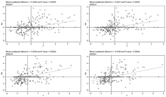 Firstly, the presence of spatial dependence is a prerequisite for applying spatial econometric models, thus requiring a test for spatial autocorrelation. The global spatial autocorrelation test reveals that the Global Moran Index consistently exceeds 07, indicating a positive spatial autocorrelation pattern of “high–high” and “low–low” clusters in the spatial distribution of urban economic resilience. Local spatial autocorrelation tests demonstrate that the Local Moran Index for representative years significantly exceeds 0, with most cities located in the first and third quadrants of spatial positive correlation areas, further confirming significant spatial agglomeration effects of urban economic resilience (see Figure 5)8.