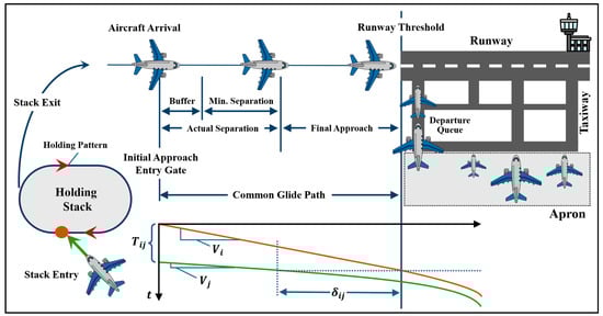 A schematic sketch of airside components along with a graph of landing separation distance calculation in the common glide path. Here, and denote the aircraft approach speed, is the minimum time separation at the entry gate, and is the minimum admissible distance separation for two arriving aircraft, i.e., a leading aircraft (red line) and a following aircraft (green line).