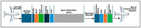 In the airfield, delays and congestion happen when the demand is greater than the capacity. Based on the existing studies in air traffic flow management (ATFM), the delays that occur at the airport can be divided into two main categories: (i) airborne delays and (ii) ground delays [,,]. There are intricate relationships among these delays, and a few studies looked at the possibility of transforming airborne delays into their ground counterparts (e.g., []). Arriving aircraft might also be delayed, ensuring the completion of the departure operation for another plane. For more details on airport delays, one may refer to [,]. Our proposed digital twin incorporates all of these delays and their interactions so as to provide a more comprehensive viewpoint of the airside system.
