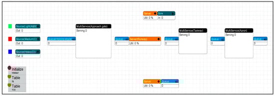 The core of the proposed model can be found in the 2D layout of the digital twin presented in Figure 3. For the three aircraft sizes considered in this system, we utilize three distinct “Source” atoms (i.e., objects) that help model the inter-arrival time of each individual type of aircraft conveniently. A “Queue” atom models the holding stack simultaneous operations. In this model, three unique “Multiservice” atoms represent the approach gate, taxiway, and apron operations. Furthermore, to model the single runway assumed in this paper, we use a “Server” atom. The service time of this server and the mentioned multiservice atoms depend on the type of aircraft. The capacity of the multiservice object is fully adjustable, which empowers this model to flexibly adopt the specifications of the real system. Another advantage of the used objects is their capability to implement the possible failures in the system (one may refer to [,,] for further information about this feature).