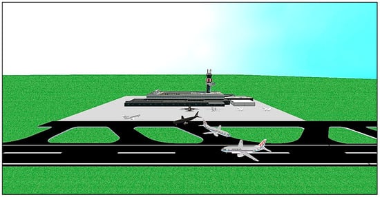 In general, existing studies either modeled the airside partially or put their main focus on scheduling of arrivals and departure events. This keeps them far from what managers would consider a practical decision support tool []. To address this gap, a few conceptual frameworks were proposed by Zografos and Madas [] and Oliveira [] to help managers analyze the system using various performance measures. In the most recent attempt in 2020, Oliveira [] investigated the benefits of developing a digital twin for the airports. Being an experienced airport project manager and infrastructure expansion consultant herself, the author sees today’s airports as cyber-physical systems for which building information modeling (BIM) technology and 3D visualizations are essential for facilitating proper decision making.