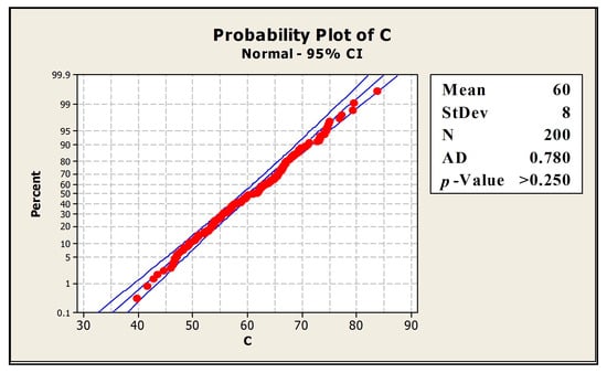 For each of these parameters, the data is examined statistically to identify the best statistical distribution. These goodness-of-fit tests were performed on more than 150 random samples derived from the data, and the best-fit distributions were identified with a 95% confidence interval. Figure 5 demonstrates this test for the landing ROT of aircraft type C, for which the 200 data points randomly fall around (and close to) the fitted normal distribution line. As seen in this figure, the chosen distribution type (here, normal) fits the data with a very high p-value (>0.250) and the Anderson–Darling (AD) values of 0.780, which indicate no significant type-I error for this fit. The estimated mean and standard deviation of this parameter are approximately 60 and 8 s, respectively.