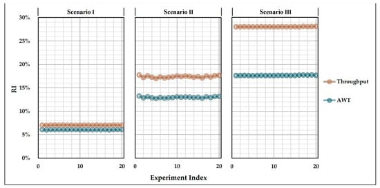 where and , respectively, represent the throughput and AWT of scenario , and the pair (, ) refers to the mean values of the current state. Figure 6 illustrates all experiments performed regarding these three scenarios from their RI value perspective.