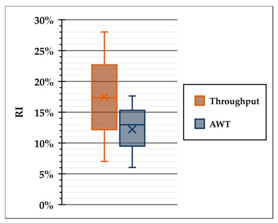 The aggregated box plot of the achieved relative improvements (RIs) in all carried out experiments for the investigated KPIs.