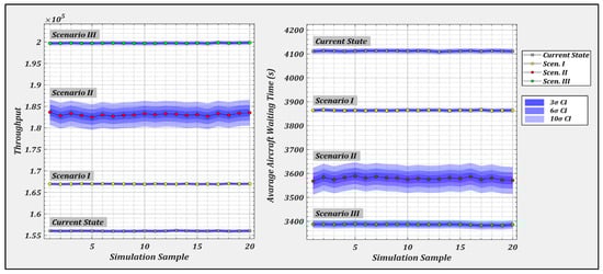 The box plot provided in Figure 7 also offers a holistic picture of the improvements achieved in these experiments regardless of their scenario index. These graphs suggest that the proposed scenarios can achieve a relative improvement between 7% and 28% in the overall throughput indicator, while the AWT was approximately reduced by 6 to 18 percent. The charts in Figure 6 highlight that scenario III outperforms the other two options from both throughput and waiting time perspectives. Moreover, it is observed that the two lines (i.e., throughput and waiting time) diverge in a stepwise manner. This means that the transition from scenario I to III affects the throughput more than it does with the AWT. Furthermore, the low deviation observed in each step of this chart and the standard deviation values reported in Table 5 both indicate that the experiments are all successfully logged in a steady situation, which means the chosen warm-up period was sufficient for this study. In Figure 8, we provide a numerical comparison of the nominal throughput and AWT estimation under the proposed scenarios with the current airport settings, along with the relevant confidence intervals, in order to see the benefits of such low standard deviation values. As shown in these graphs, the significance of the results distinction depends on the variance of the experiments for each scenario. Since the values for all scenarios were reasonably low, the scenarios do not overlap even in the highest confidence intervals.