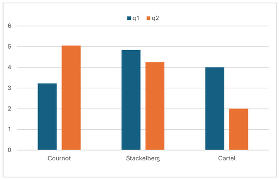 Example 2. As in Example 1, let us assume that , , , , and , , with an expected base demand of . For the Stackelberg game model, the Nash equilibrium quantities are and , with prices and . The Stackelberg model equilibrium profit for company 1 is , and for company 2, it is . It is noteworthy that despite company 1 supplying 50% more energy at the Stackelberg model equilibrium, its profit only increases by 12.5% compared with the Cournot model equilibrium. Furthermore, despite the higher total energy supplied to the market at the Stackelberg model equilibrium, , compared with the Cournot model equilibrium with , the combined profit for both companies decreases from to .
