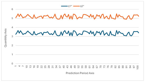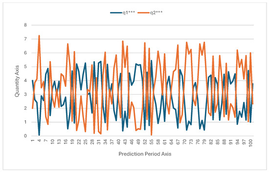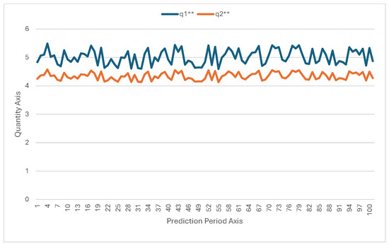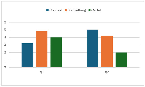 In the proposed Stackelberg duopoly model, the two companies sequentially determine their best response quantities, denoted as and . Company 1 assumes the role of the “leader”, while Company 2 plays the role of the “follower”. The Nash equilibrium market prices and are derived using backward induction, considering the first and second-order derivatives. Backward induction is commonly applied in extensive games with perfect information, solving the game backward based on the assumption of common knowledge rationality.
