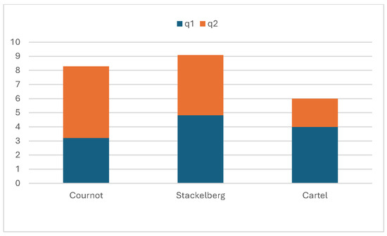 Assumption 6. We assume that the Cartel model parameters satisfy the conditions:and Proposition 3. Under Assumptions 1–3 and Assumption 6, the Cartel model Nash equilibrium prices would be:and Example 3. In our previous example, the total quantity provided by the cartel would then be . The energy prices set by the cartel would be and . The total profit of the cartel is 132, with company 1 receiving 88 and company 2 receiving 44. This total profit surpasses that of any other configuration. Despite producing less energy, the cartel ensures that prices remain high, resulting in increased profit.