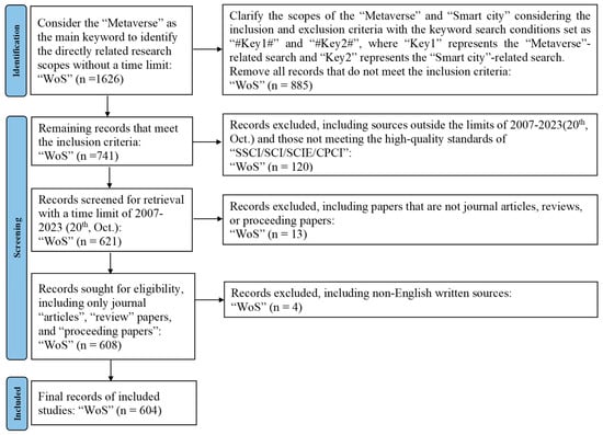 To further ensure the appropriateness of the keyword string selection, beyond considering the inclusion and exclusion criteria when setting the search parameters, each author of this paper also carefully reviewed and confirmed that the search strings accurately cover both the “Metaverse” and “Smart city” aspects, while fully addressing the three dimensions of technology, people, and institutions within the context of smart cities. This review and confirmation process improved the precision of the search and helped to avoid potentially misleading results.