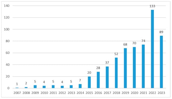 The trend graph (Figure 3) below, obtained from the “WoS” database, shows that research on the “Metaverse” in the context of smart cities began to appear as a notable theme in 2007. The steepest growth trend is observed after 2014. The number of related papers published increased from 1 in 2007 to 135 in 2022 and 89 as of 20 October 2023.