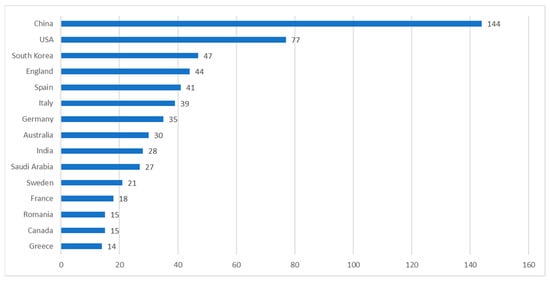 Examining the distribution of documents by country, it was found that nearly 79 countries and regions contributed to the research on the “Metaverse” in the context of smart cities. The top 15 countries are China (144, 23.68%), USA (77, 12.66%), South Korea (47, 7.73%), England (44, 7.24%), Spain (41, 6.74%), Italy (39, 6.41%), Germany (35, 5.76%), Australia (30, 4.93%), India (28, 4.61%), Saudi Arabia (27, 4.44%), Sweden (21, 3.45%), France (18, 2.96%), Canada (15, 2.51%), Romania (15, 2.47%), and Greece (14, 2.30%). Figure 4 illustrates the number of records from these countries.