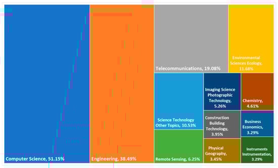 Regarding the research fields, the majority of the publications are from the field of “Computer Science (51.15%)”, followed by “Engineering (38.49%)”, “Telecommunications (19.08%)”, “Environmental Sciences Ecology (11.68%)”, “Science Technology Other Topics (10.53%)”, “Remote Sensing (6.25%)”, “Imaging Science Photographic Technology (5.26%)”, “Chemistry (4.61%)”, “Construction Building Technology (3.95%)”, “Physical Geography (3.45%)”, “Business Economics (3.29%)”, and “Instruments Instrumentation (3.29%)”. Figure 5 illustrates the research areas with more than 20 records.