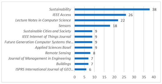 Concerning the productive sources, we found that “Sustainability (38, 6.25%)”, “IEEE Access (26, 4.28%)”, “Lecture Notes in Computer Science (22, 3.62%)”, and “Sensors (18, 2.96%)” showed high productivity. The following journals were also identified: “Applied Sciences Basel”, “Future Generation Computer Systems the International Journal of Escience”, “IEEE Internet of Things Journal”, “Sustainable Cities and Society”, “Remote Sensing”, “Buildings”, “Journal of Management in Engineering”, and “ISPRS International Journal of GEO Information”. Each of these journals published fewer than ten papers from 2007 to 20 October 2023 (Figure 6).