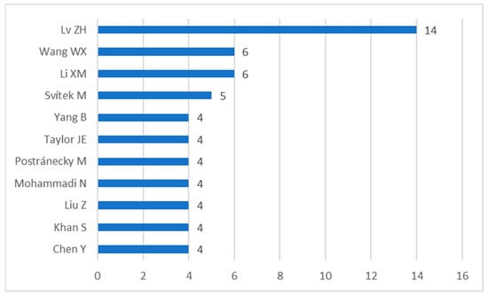 In terms of author distribution, 2111 individuals contributed to the “Metaverse” research centered on smart cities. Figure 7 lists the most productive authors with three or more works as follows: “Lv ZH (14)”, “Li XM (6)”, “Wang WX (6)”, “Svítek M (5)”, “Yang B (4)”, “Taylor JE (4)”, “Postránecky M (4)”, “Mohammadi N (4)”, “Liu Z (4)”, “Khan S (4)”, and “Chen Y (4)”.