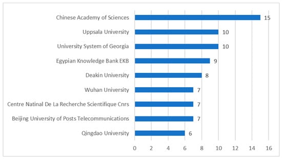Turning to affiliation distribution (Figure 8), the most productive institutions (with more than five works) were identified as following: “Chinese Academy of Sciences (15)”, “University System of Georgia (10)”, “Uppsala University (10)”, “Egyptian Knowledge Bank EKB (9)”, “Deakin University (8)”, “Beijing University of Posts Telecommunications (7)”, “Centre National De la Recherche Scientifique Cnrs (7)”, “Wuhan University (7)”, and “Qingdao University (6)”.