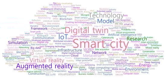 High-frequency keyword analysis focuses on identifying and examining the most frequently occurring keywords within a set of documents. This method often uses the word cloud analysis approach [51,105]. In this paper, Figure 9 is the word cloud that shows the most frequent keywords among selected sources about the “Metaverse” research related to smart cities. The size of each keyword label corresponds to its frequency of occurrence in the documents, with larger labels indicating higher frequencies and smaller labels indicating lower frequencies. Recognizing the frequency of keyword occurrence is crucial in achieving our research objectives because it helps identify a field’s hotspots and predict future research trends [51,105]. In Figure 9, it is evident that “Smart city”, “Digital twin”, “IoT”, “Augmented reality”, and “Technology”, are the top five keywords with the highest frequencies. These frequencies suggest that these keywords play an important role in the “Metaverse” research related to the “Smart city”.