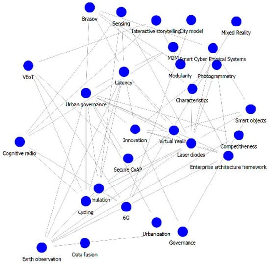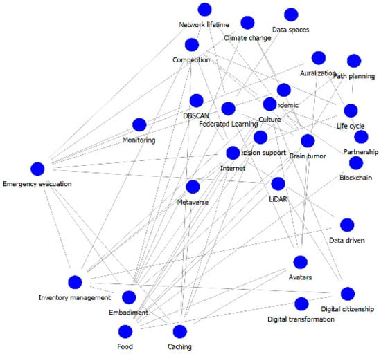 During Stage 2, the number of papers on “Metaverse” research related to smart cities increased to 284. From the keywords retrieved for these papers and the calculation results of each keyword’s degree and betweenness centrality, it seems that researchers showed a strong interest in technology during this period. Keywords like “laser diodes”, “latency”, “augmented reality”, “mixed reality”, “innovation”, “6G”, “simulation”, “interactive storytelling”, “sensing”, “VEoT” (the Virtual Environment of Things), “data fusion”, “modularity”, “photogrammetry”, “CityGML” (City Geography Markup Language), “M2M” (Machine to Machine), “Secure CoAP” (Secure Constrained Application Protocol), “smart cyber–physical systems”, and “smart objects” illustrated high degree centrality values. In addition, “urban governance” and “characteristics” exhibited the highest betweenness centrality during this period. To further highlight these influential topics during this period, this paper mainly focused on the top 30 keywords ranked by degree centrality while also considering betweenness centrality. Table 5 lists these keywords, and Figure 11 presents the corresponding keywords network in Stage 2.