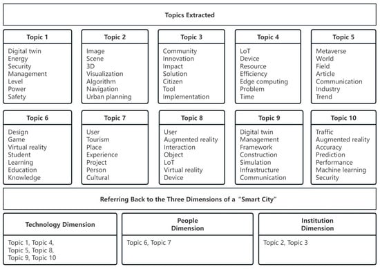 In this study, a science mapping analysis was also conducted to visualize the systematic development status of “Metaverse” research in the field of smart cities across the three dimensions of technology, people, and institutions. This technique includes both keyword analysis and topic modeling analysis. Keyword analysis covers high-frequency keyword analysis and keyword network mapping, while topic modeling analysis includes topic extraction analysis and topic ratio analysis.
