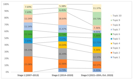 According to this classification, this paper constructed a keyword network for each stage, where keywords were treated as nodes. To gain deeper insights into the structure of these networks, an analysis was conducted using indices such as degree centrality and betweenness centrality associated with the nodes. Degree centrality was computed as the number of direct linkages to a node. A high degree centrality score indicates that a node has many linkages pointing to it, reflecting its potential importance in the research area [108]. Betweenness centrality was calculated based on the number of shortest paths from all vertices to all other nodes, which can also be considered a measure of a node’s importance. A node with high betweenness centrality can link key nodes to others, highlighting their potential importance as a research topic [108,109].