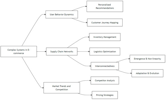A conceptual diagram of the many elements of complex systems in e-commerce, such as supply chain networks, market competitiveness, and user behavior dynamics, is shown in Figure 1, highlighting their interdependence and non-linearity. It has been shown that in order to fully understand supply networks’ intrinsic complexities, they need to be seen as complex systems. The CAS perspective emphasizes the value of flexibility and adaptation in management strategies by enabling a more nuanced understanding of how supply chains function under various circumstances. The unpredictable character of supply networks is frequently overlooked by traditional approaches that rely on static models, particularly in stormy contexts where quick changes can occur [31,32].