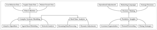 Figure 2 shows a flowchart or framework highlighting the steps involved in data gathering, model adaptation, real-time analysis, and decision-making in an e-commerce scenario. It incorporates concepts from complex systems theory into predictive analytics. Physical data from e-commerce transactions with digital modeling allow firms to construct responsive and adaptive systems that can predict market shifts and consumer preferences. Complex systems include complex interdependencies and emergent behaviors, making classic analytical methods unsuitable [97,98].
