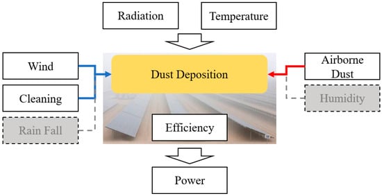 Local weather has a major impact on soiling through particle deposition and removal. Figure 1 illustrates various influential parameters, including airborne dust, wind speed, humidity, temperature, and rainfall. Airborne dust is the most dominant factor, followed by wind, which can help accumulate dust on the panels at low wind speeds as well as remove it at higher speeds. These parameters affect the amount of dust deposited on the surface that can shade, block, or limit the sun’s irradiance, thus reducing the amount of power generated from the PV panel.
