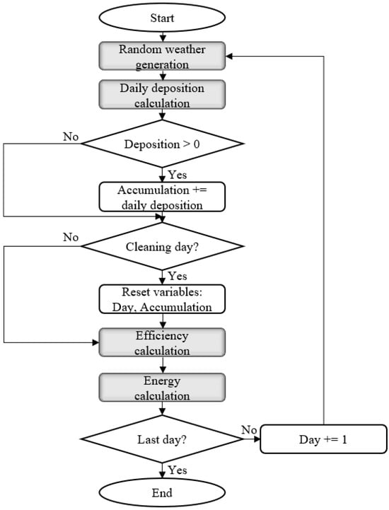 If the current day is not a cleaning day, the model proceeds to check the accumulation value. If it is below the minimum residue , the accumulation is assigned the value of (see Equation (5)). The model continues to calculate efficiency using Equation (6) and energy loss using Equation (7). When the day counter reaches the last day of the lifespan, the logic ends; otherwise, the day counter increases by one day and goes back to the starting point.