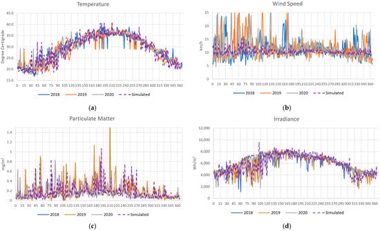 We collected several streams of data from different sources. In particular, four weather parameters—temperature, wind speed, particulate matter, and irradiance, as presented in Table 2—were gathered from 2018 to 2020 in the target area, Abu Dhabi. The daily average was used to represent the daily data for temperature and wind speed. Irradiance is the value measured throughout the day by the National Center of Meteorology [44]. Regarding particulate matter, the Sand and Dust Storm Warning Advisory and Assessment System provides particulate matter data recorded at 12:00 PM GMT [45].