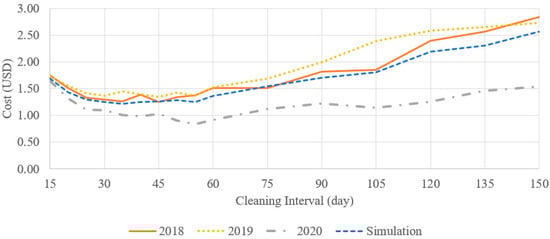 For the simulation model, each detailed logic was validated thoroughly with different test cases. To validate the model, we conducted an experiment using Excel (v2409 in MS Office 365) manual calculations and the simulation model with the same cleaning intervals, cleaning cost, and electricity tariff. The Excel calculations were performed using the weather data for 2018, 2019, and 2020, but the simulation model used the randomly generated weather data. As can be seen in Figure 4, the resulting total cost curve from the simulation model shows a similar pattern to the curves generated based on the Excel calculations, validating the computational logic in the simulation model.